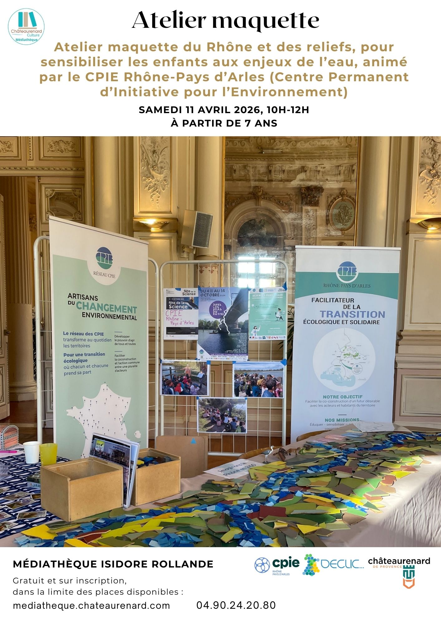 Atelier maquette du Rhône et des reliefs, pour sensibiliser les enfants aux enjeux de l’eau et à la protection de l’environnement, animé par le CPIE Rhône-Pays d’Arles (Centre Permanent d’Initiative pour l’Environnement).